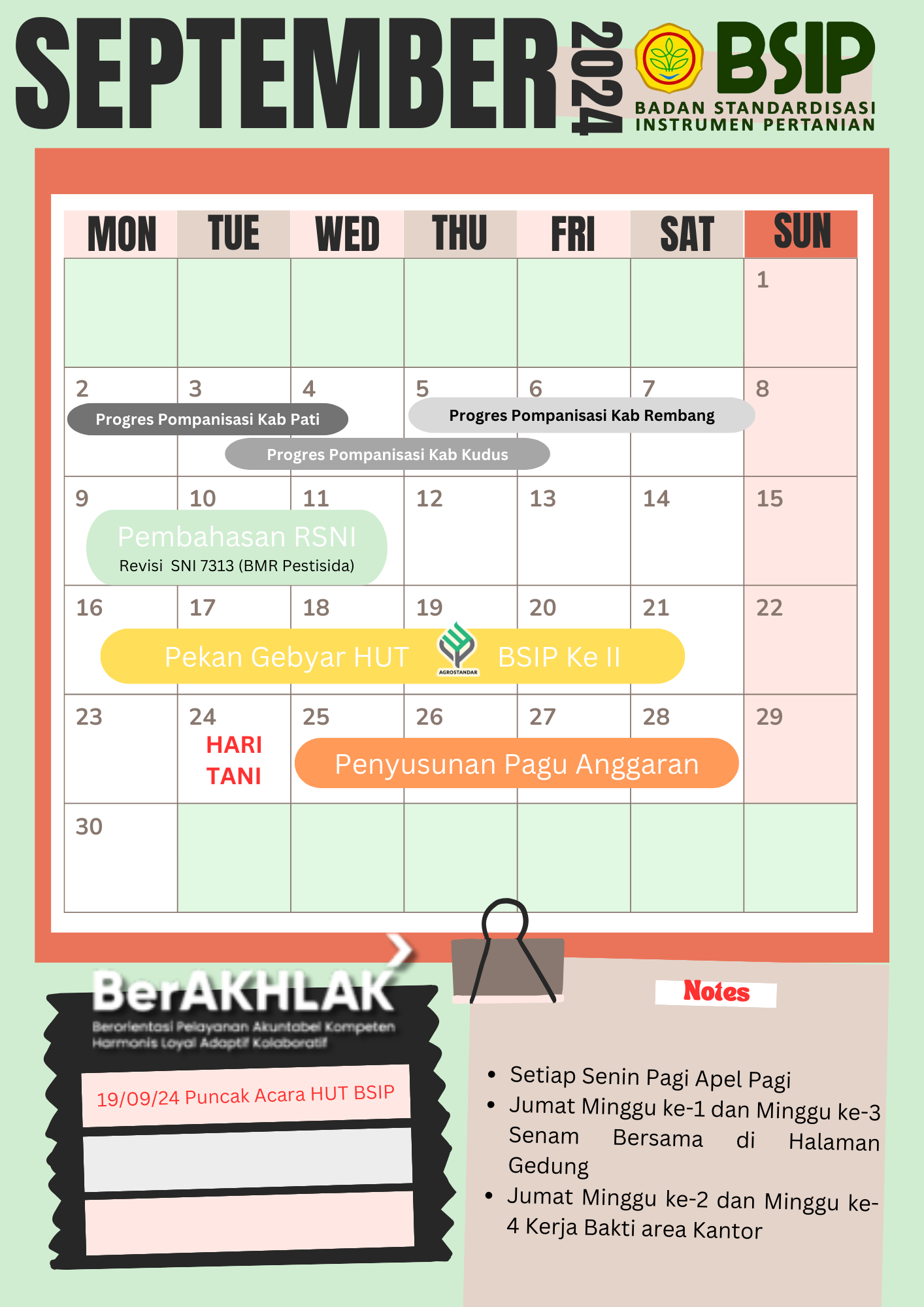 | 16 | 30 Sep 2024 | Agenda September 2024 | BSIP Lingkungan Pertanian | Daftar Agenda Bulan September 2024 BSIP Lingkungan Pertanian |