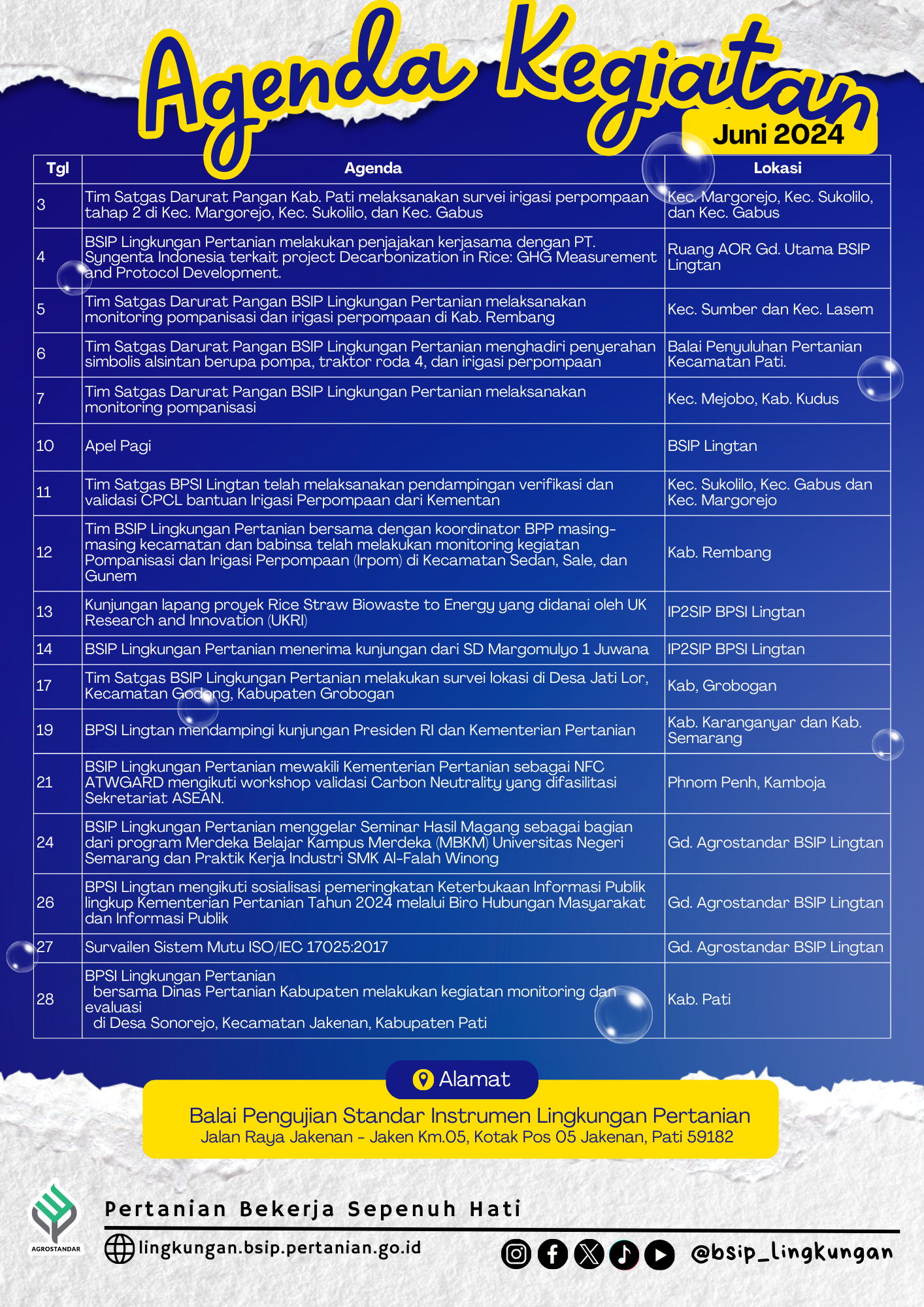 | 19 | 30 Jun 2024 | Agenda Juni 2024 | BSIP Lingkungan Pertanian | Daftar Agenda Bulan Juni 2024 BSIP Lingkungan Pertanian |