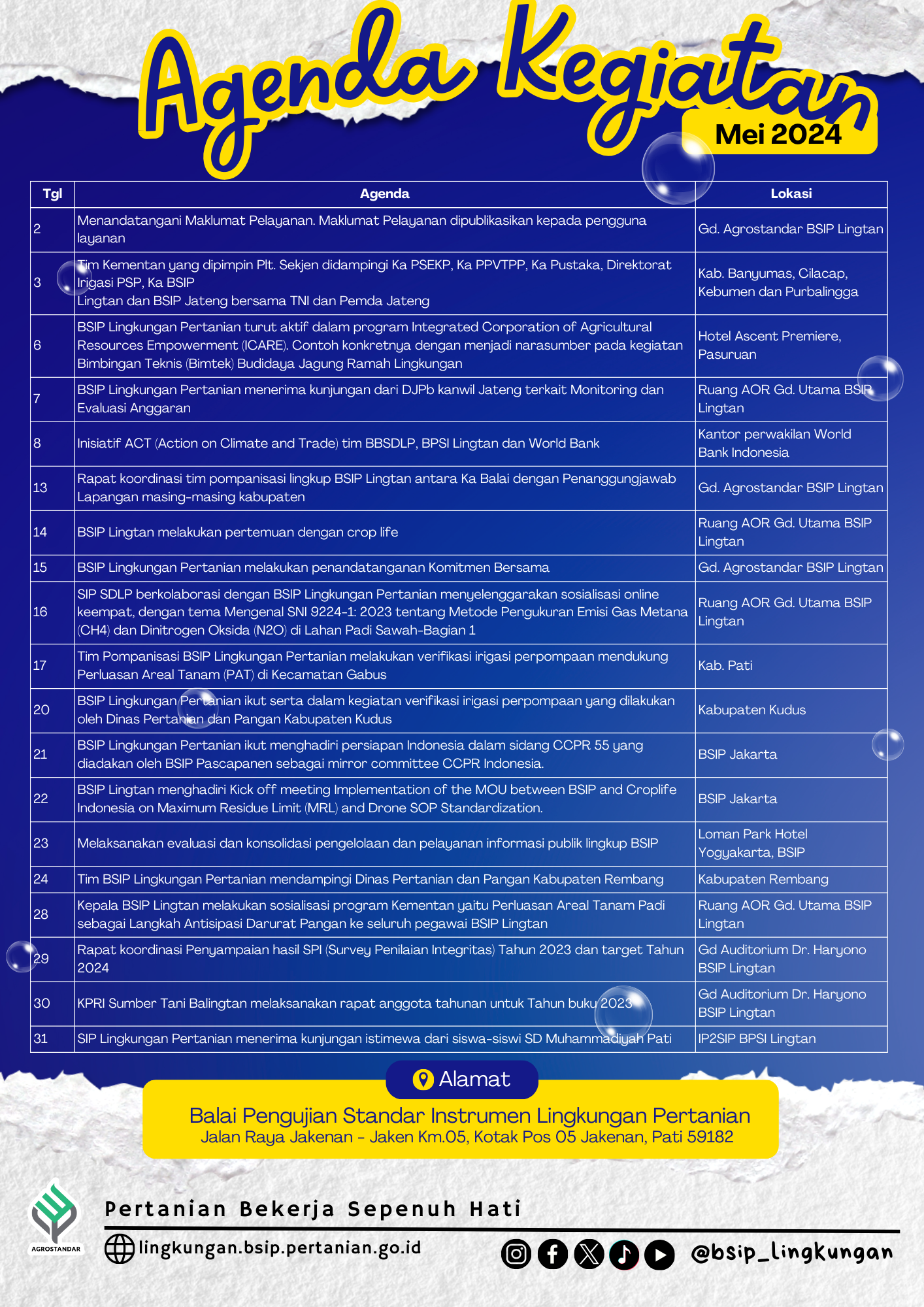 | 20 | 31 May 2024 | Agenda Mei 2024 | BSIP Lingkungan Pertanian | Daftar Agenda Bulan Mei 2024 BSIP Lingkungan Pertanian |