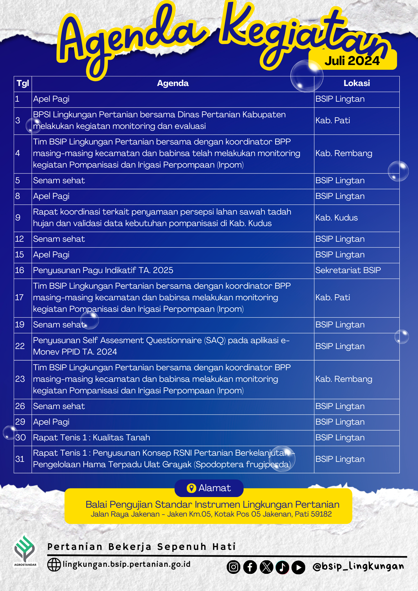 | 18 | 31 Jul 2024 | Agenda Juli 2024 | BSIP Lingkungan Pertanian | Daftar Agenda Bulan Juli 2024 BSIP Lingkungan Pertanian |