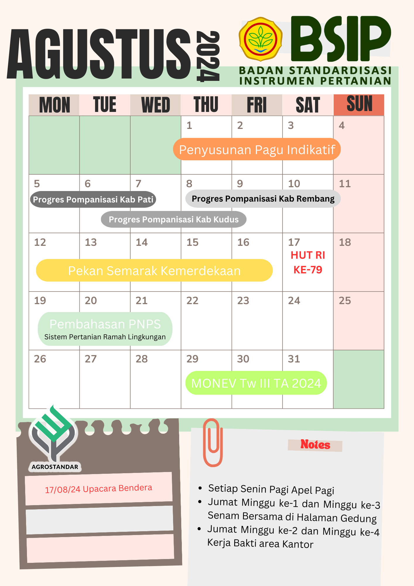 | 17 | 31 Aug 2024 | Agenda Bulan Agustus 2024 | BSIP Lingkungan Pertanian | Daftar Agenda Bulan Agustus BSIP Lingkungan Pertanian |