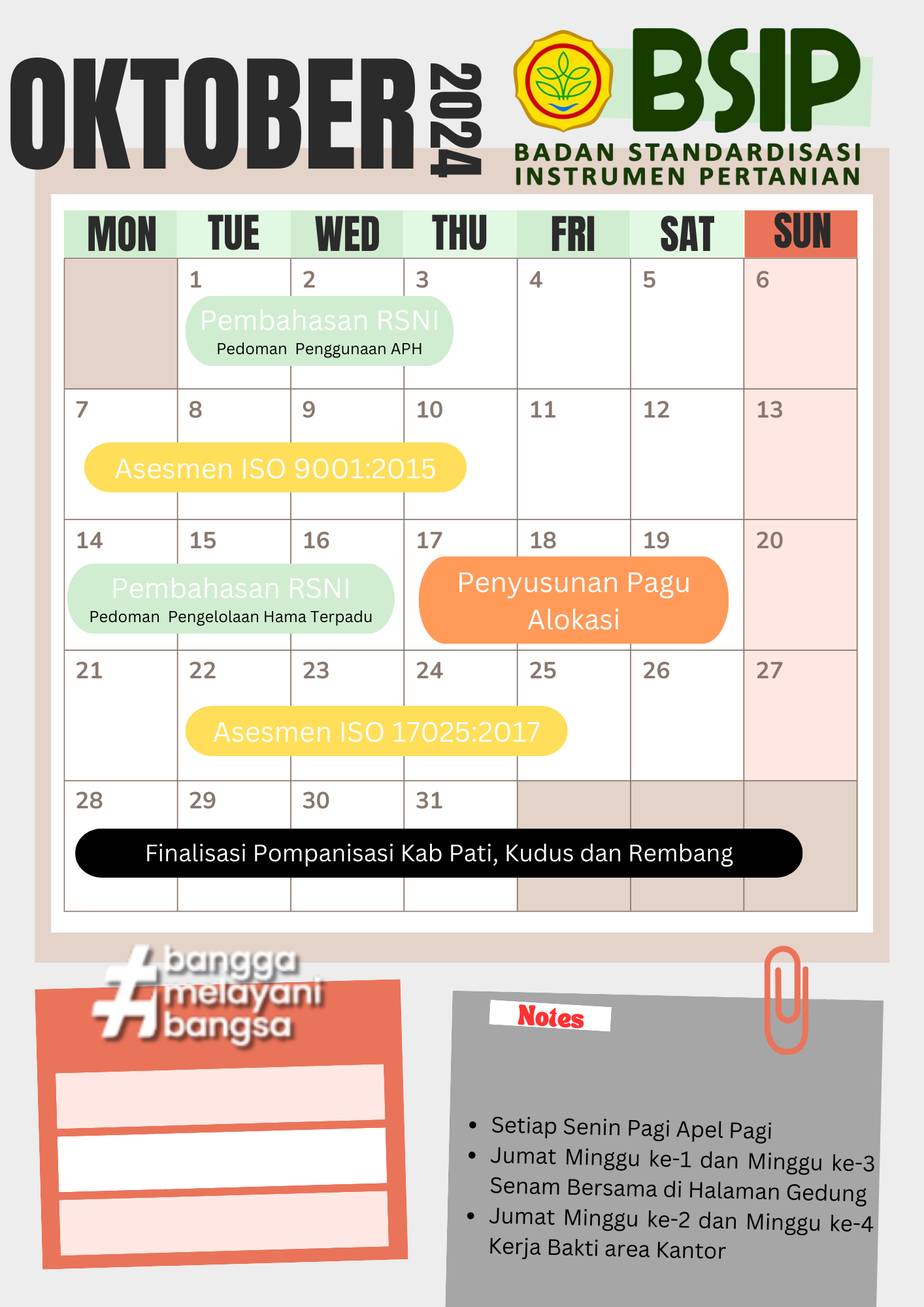 | 15 | 31 Oct 2024 | Agenda Oktober 2024 | BSIP Lingkungan Pertanian | Daftar Agenda Bulan Oktober 2024 BSIP Lingkungan Pertanian |
