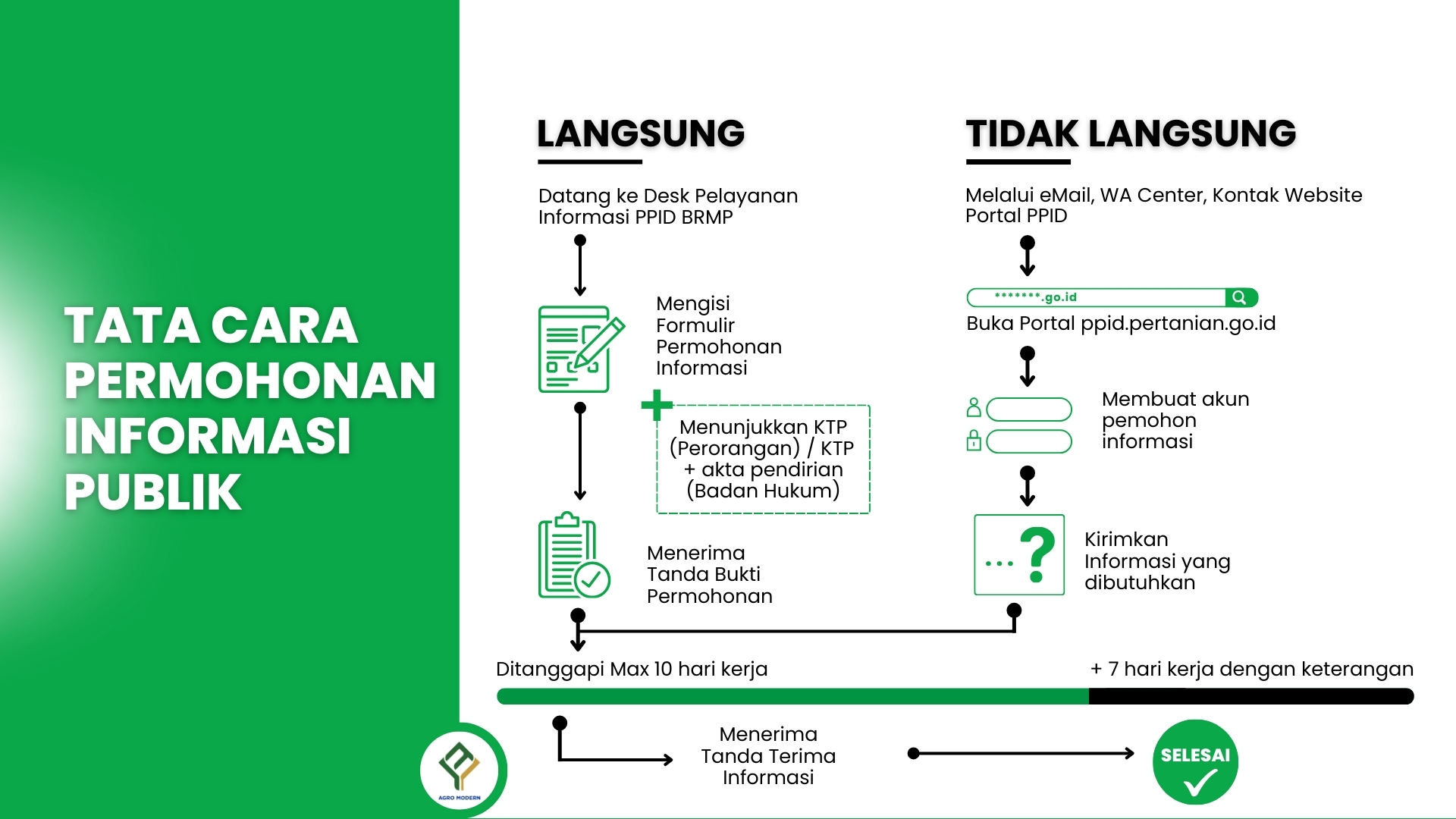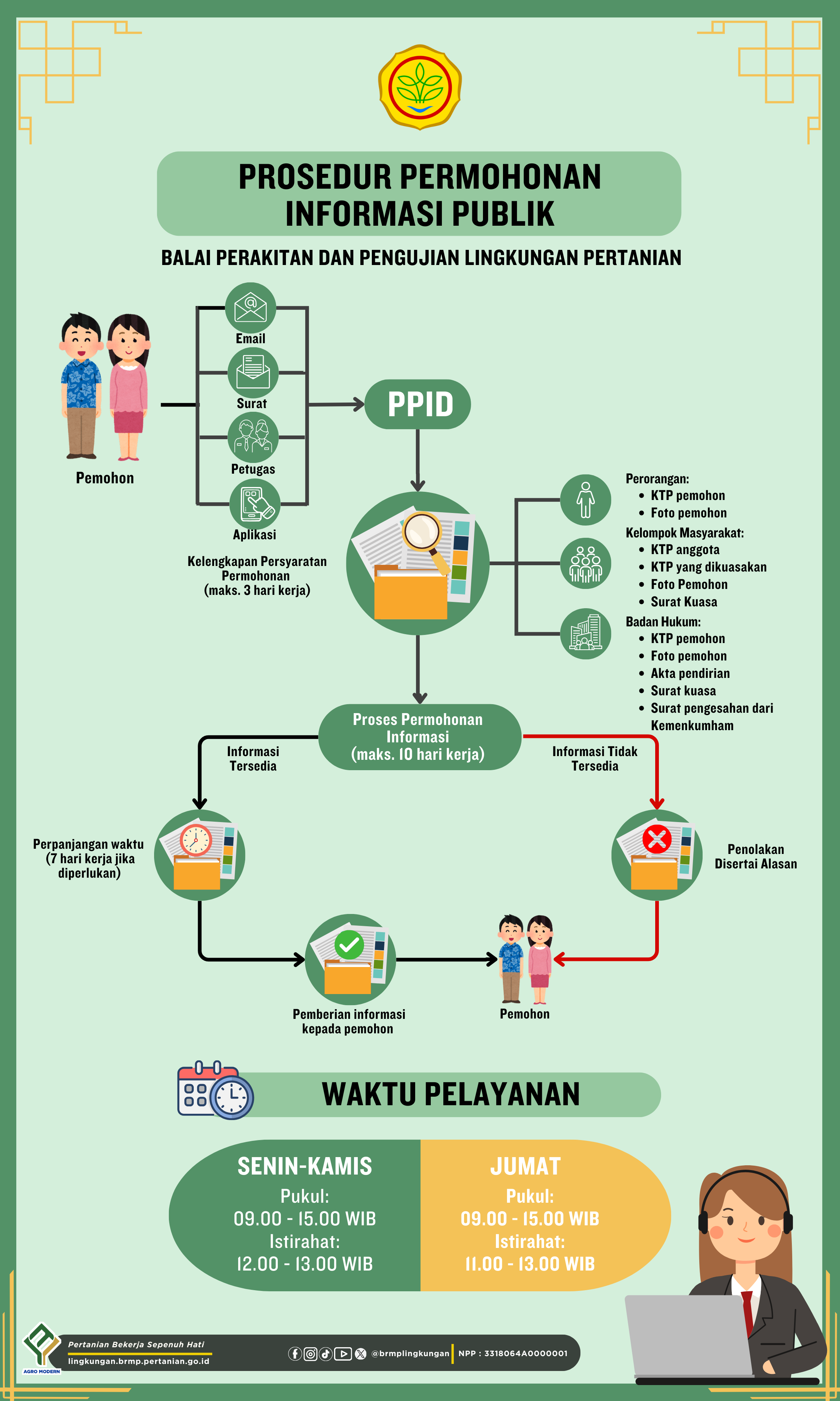 Prosedur Pelayanan Informasi Publik Balai Perakitan dan Pengujian Lingkungan Pertanian disusun berdasarkan Peraturan Menteri Pertanian Nomor 32/Permentan/OT.140/5/2011 tentang Pengelolaan dan Pelayanan Informasi Publik di Lingkungan Kementerian Pertanian dan Peraturan Komisi Informasi Republik Indonesia Nomor 1 Tahun 2021 tentang Standar Layanan Informasi Publik.
